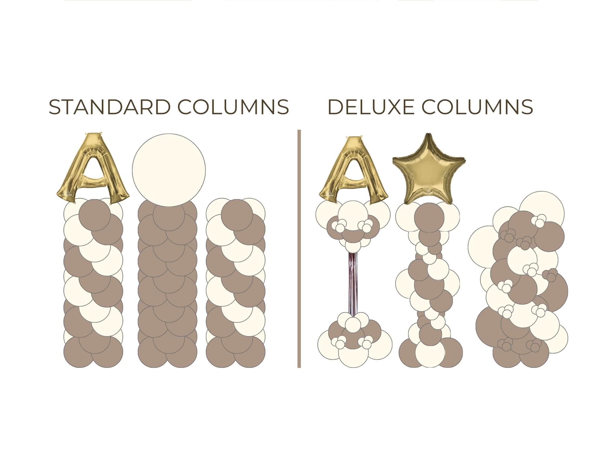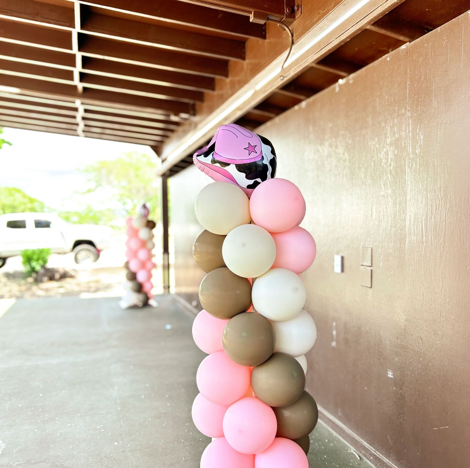 Deluxe Columns with blue fringe, fairy lights, balloon detailing & toppers: foil balloons & clear bobo balloons with stuffed animals inside